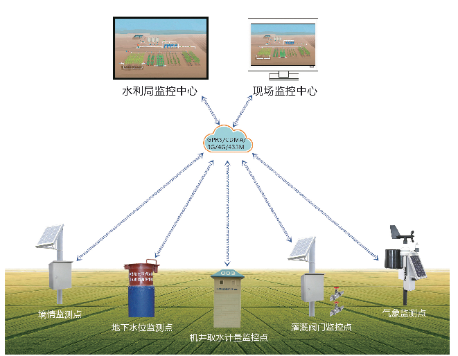 節(jié)水增糧信息化監(jiān)控系統(tǒng)基于機(jī)井取水計(jì)量監(jiān)控、地下水位監(jiān)測、土壤墑情監(jiān)測、田間氣象監(jiān)測、灌溉自動控制等系統(tǒng)進(jìn)行多功能設(shè)計(jì),采用GPRS/CDMA或433MHZ的無線通信方式,實(shí)現(xiàn)監(jiān)控中心對多測點(diǎn)的遠(yuǎn)程監(jiān)控,為農(nóng)田水利管理和水資源監(jiān)管提供了可靠的技術(shù)保障。